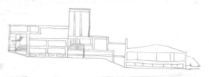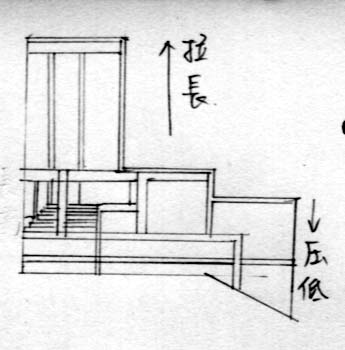 當我們去讀一個平面圖或是剖立面圖都可以嘗試去拆解它 ,做任何的改變在去組合,就會發現新的圖與原來的圖更加有趣,你可以去發現更深一層建築的涵意,當你自由的拆解去發展每一個拆解後的個體單元,會發現這類的分析手法很有趣,且能讓你發現更多你可能想不到或原本看不到真正的本質,從這當中你會發展出更多有意義的東西來. 經過拆解變形後的剖面圖前後的差距很大,從兩張圖看來變形後的剖面圖較有空間量感上的變化,也較有中心點式的建築體,與之前原剖面圖比較起來原來的剖面圖較沉穩,變化後的剖面圖較有跳躍性思考的感覺. |