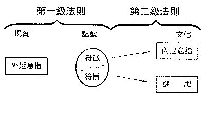 因此,從圖三看來,羅藍•巴特其實是將現實(reality)事物的外延意指只(deotation),特過記號分析,演繹出事物深層的文化意義,內涵意指和迷思,這種精神普遍表現在他文化觀察論述中。第一級表意法則,描述記號中符旨和符徵的關係,以及記號和外在現實的關係,羅藍•巴特特稱為外延意旨,仍是參照常識或符號明顯的意義;這一部份已由索絑爾提出。例如景物相同的彩色/黑白、柔焦/粗獷、特寫/遠拍照片,其外延意義並無差異,所不同的乃是內涵意義。