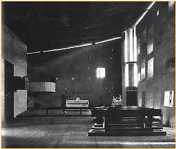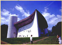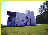 作品式樣分析(2) 廊香教堂 1950~1955 廊香教堂是建於西元1950~1955年,基地是位於丘陵上的一塊地, 東南方是一緩坡,連接對外的道路也經由此面緩緩向下連通。 西面則是由大片的樹林圍繞,因此向東面即是一較開放型的空間, 而在這丘陵地上的基地中,最佳的視覺景觀點,是在東向到南向的方位。 由於基地位於丘陵之頂,其位置顯示出其山上的視覺效果, 教堂所代表的意義是神聖以及崇高。 設計理念: 對於人自然和宇宙之間關係上的信仰。教堂一直在敘述著對比︰ 造型的對比、光線的對比、空間的對比,………等, 由這些物的對比也暗示著人的對比、存在這時空中眾多生命的對比。 建築的位置藉由面對朝聖者的途徑給予移動上及視覺上的引導, 在於整體的配置上,主要是藉由軸線的引導方式, 來強調教堂的神聖性以及崇高性。