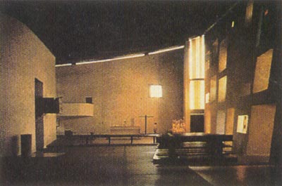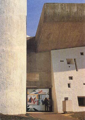 champ是看不到的,相反的,是那些彎曲弧線加以建構組合。其中,他的複雜性與歌德式教堂有著處理上的異同,兩者在於:歌德式的複雜在於細部的處理,而其總體空間佈局則較為簡單、類同,Ronchamp則相反,是空間結構性的複雜,無論是牆面或是屋簷,在處理上仍然是簡潔的。