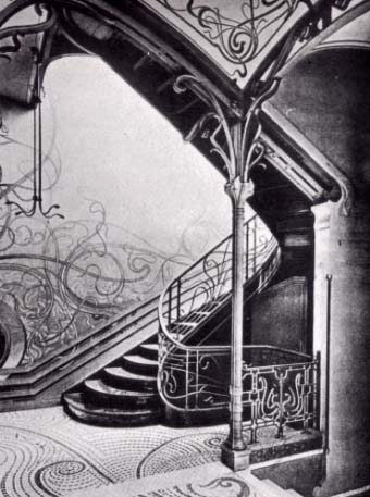 在獨特的創意上,牆面與拱頂的表面上以及拼花地板,都隨意綴飾著如漩渦曲線的圖案線條,這是建築方面第一次所出現的新藝術。當然鑄鐵構造的材質,在這空間中被大量的使用,讓理性的風格(落水山莊),為之驚艷。