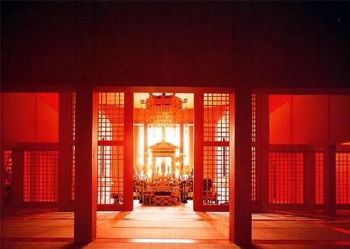 水御堂外部的石牆入口與兩堵高牆,仍以混凝土為建構材(真材實料;這真材實料可以是如純粹樸實的水泥,或未刷漆的木頭等物質);而室內則以木構造營造而成,細緻高雅,光的傳遞,營造出佛界的莊言語慈悲,與科比意朗香教堂一樣對光線的塑造上,別具新意。