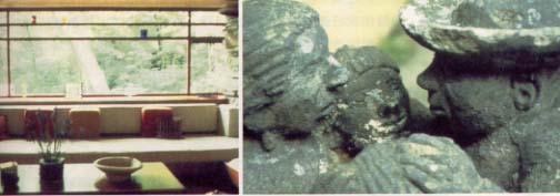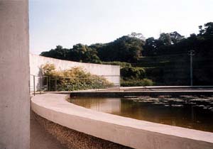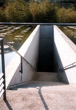 水御堂建於一橢圓形的水池裡,與之相較確實有其相當差異;一個是典雅、古樸的雕塑品,讓人對之欣賞;另一個則是謙卑的隱含於地底之下,有如與大地渾元一般,自然無爭(如道家的無為之法);暗喻出有如修為內斂的高僧,清靜無染於紅塵之間。