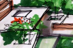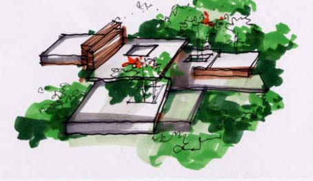 在以大體為方格狀的建築量體中與環境的接點上,仍過於「絕對分割」,因此會以下列兩個方式來進行:一、建築量體中擴大石材的面積比,二、在方塊量體當中,差集出交錯面積,並將植物植種於量體四周,使得空間與環境之間產生交集,並切更加融入於建築量體之間。