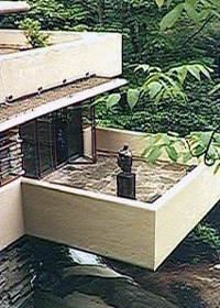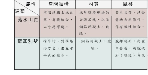 以作品涵構為對象:落水山莊成功的與周圍環境緊密的結合,與自然之間達到和諧之美,上下出挑的平台,輕盈的凌立於流水之上,何許瀟灑,收放開合間,道盡有如東方太極的動靜之姿,以石版堆疊成牆柱,硬生生的嵌入岩石堆中,使建築物與四周「材質」,共生並存,為「有機建築」的最佳詮釋。
