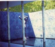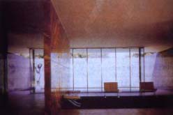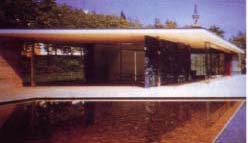* 評析:此次所選擇的兩件作品,雖然為同一時期,然而在設計手法上,確有所截然不同;朗香教堂想以遠古樸質展現地域性的神秘色彩,以追塑生命力的本質性。而在巴塞隆納所展出的德國館卻展現出極為簡單、簡鍊的形體,去掉附加的裝飾,而突顯出建築材料本身固有的質感與紋理,牆也是簡單的光禿板面,讓人所看到不同於朗香教堂的古樸特質。