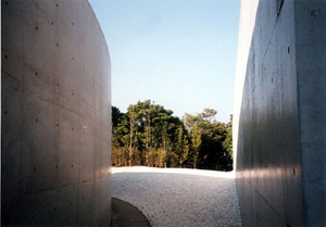 科比意朗香教堂與安藤忠雄所設計的佛堂-----真言宗本福寺水御堂做比較,水御堂的建築表現,顯示出安藤忠雄對自然的崇敬,看不見什麼高大的結構體,只有一條石路,兩堵牆。似乎隱含著內斂的大愛情懷。