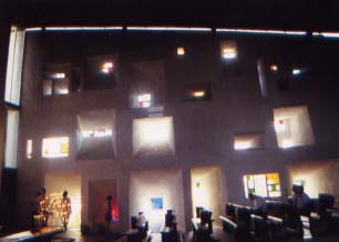 (3)結構上:洞窗開口的南向弧形牆面,看起來量感十足且粗獷,然而卻並非承重結構系統,其主要在於運用混凝土柱樑框架構造,以預鑄的小樑固定並連繫住外牆與內牆的裝修材料,外部光線也適時的滲透入內,形成一細緻光帶,更顯空間層次的多樣化,讓整體看來略為笨重的、粗獷的建築量體,顯得輕盈有如片刻般的呼吸,表達出非承重牆的構造系統;外牆由地面厚度3.7公尺的西側一直延續到東側縮小為1.4公尺,牆厚也由下而上逐漸縮小,其最高處為0.5公尺,整體建築有如大鐘般的穩定矗立著,在開窗部,也因厚度的差異,引領光的表情豐富而趣味的展現於室內。