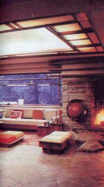(2)以共構性來說:在設計落水山莊時,一如他一貫的設計風格,在擬定設計規劃時,並非僅就建築單體考量,而是連同周圍森林環境也一併考慮進去,當然也包含室內傢俱與擺設。例如,在二樓起居室的設計,萊特「借入」戶外景色,致使屋內以全面性開窗設計,讓室內與室外「連成一氣」,達到室內與室外「和諧共生」的美感。
