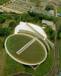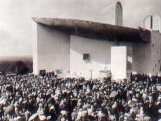 champ)確有如一座雕塑品,吸引著人們的視點;水泥噴漿刷白色漆的牆面頂著灰色清水混凝土曲面屋頂,以及三座採光塔樓,形成在色彩上與形式上極為強烈的對比;細緻且自信的標誌在視點之中,或許是每年兩次的朝聖活動吧!換做別人,可能來個超大型「購物中心」,來滿足這多達一萬兩千人以上的儀式,Le