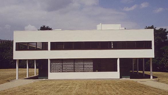 * 評析:落水山莊結合了當地的景觀環境,和諧的共生並存;萊特以「有機工法」,塑造出符合和機能與視覺美感的建築藝術,當地的材質亦是建築的一部份,交相呼應、錯置,產生結構的空間層次感。另外,薩瓦別墅與落水山莊在建築的概念上就有顯著的差異;建築營造的自主權是建立在主事者(建築師)身上,為了取得最佳視野,加上因地面的潮濕而導致的不衛生,因此,主要的生活空間與住家花園就在3.5公尺的獨立柱上產生了;建築形體有如一個大方盒子,水平帶狀的開口,加上立柱「稱高」,十分的簡潔俐落。