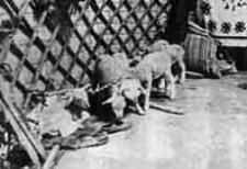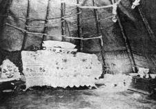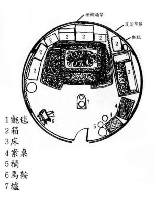 氈包的內部擺設 “氈包”內的陳設與佈置,分成住宿和放物品兩部分。前半部放物品、用具,後半部住人和待客。右上方是長輩的床位,左上方是晚輩的床位,右下方放置炊具和食品,左下方放置牲畜用具、獵具和小牲畜。正上方放置馬鞍、衣箱等。包內地上鋪有地毯或氈。正中對天窗處有火爐。在住宿處,有為老人特設的木床,氈房內部的布置是有一定模式的,就跟中國傳統建築的建築分佈和使用是一樣的有規則。物品和用具首先緊貼著柵欄牆架安放,正中是做飯、取暖用的爐子,煙囪直上伸出頂圈,面對門而言後半部的右方是長輩的床位為老人家所特製的木(鐵)床是不能在上面坐臥的,那裡也是嬰兒和哺乳婦女的休息區,左方是晚輩的舖位,有時床上遮掛布幔,客人切忌牽,否則就是失禮,中央緊挨著柵牆放有墊桌(一般高50∼60公分),上面放著箱子和被褥的東西,前面舖有氈毯做為家人起居休憩和待客用,床、舖、箱子的欄柵和撐竿上掛著鏽有各種花卉鳥獸圖案的掛毯和布簾,床的前緣和兩端有垂吊的圍簾,遮蓋欄架上的各色染物,使氈房內更為整齊些。氈房的前半部放置了炊具和食品,左方放置盛具、獵具、和幼畜。 |