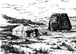 一般在氈包外的右側或左前方搭有第二個爐灶,主要適用來燒水、煮肉、煮飯(室內的爐子以煮奶茶、做飯、取暖為主)門左邊為鞍具的堆放點,氈包後側是各種染物的堆放點,附近有拴馬的拴子。