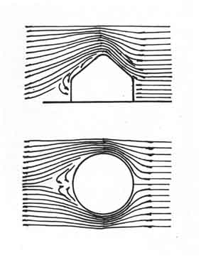 房屋構造的受力桿件為具有彈性的材料製成,節點均為絞接因為整體被綁成圓形的量體,所以整體便有了極好的柔性結構特點。況且整個建築物的外觀無論哪一面都是圓形,對任何方向來的風都能以最小的垂直接觸面積,受力、傳達,都能很均勻。 5、