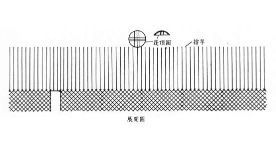 撐竿:是用直徑5CM左右,長2∼3公尺的樹幹去削皮而成,一端彎成淺弧形,長為50公分左右。搭建時將圓弧的一端用繩綁在柵欄牆架的兩支支桿相交處上,另一端則插入頂圈的孔眼內。再靠近弧形,人的視線看的到的撐竿直線部位,通常都會刻上一些花紋。