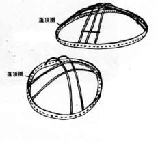 頂圈:是用直徑5公分左右的樹幹去皮,圍成圓形,其直徑在1公尺到1.5公尺左右,圈上每隔3公分鑽一孔眼(為撐竿插入用),圓圈內以兩對或三對細樹幹彎成50公分左右的弧形,相連接作為圓形凸出成穹廬形的形狀,這個部位是氈毯頂部蓋頂氈的地方,更可以隨意調整頂氈以調節通風量和採光量,所以是氈房唯一的窗戶,也是爐灶煙囪的出口處。 |
