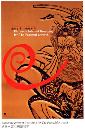 五、訪談內容 筆者於九十一年四月上旬來到位於高雄市的翰堂廣告事業有限公司,在濃郁中國風味的室內中,富藝術家氣質的林先生接受了筆者的訪談,娓娓道出他在設計界工作多年來的感想與心得。 問:貴公司發展的歷程為何? 林:我在1984年退伍之後即投入設計實務界工作,第一份工作是在房地產公司任職,由於不到三個月後這家公司即倒閉,因此進入一家設計公司工作。任職五年 後,在外界的肯定與支持之下,於1988年創立了林宏澤設計工作室。工作室成立之初,可說是家徒四壁,三個月後才有錢買傳真機,又過了數月才買了影印機,一切皆是從無到有、辛苦走來。 成立個人工作室之後,由於外界多方的肯定,也帶來盛名之累,致使工作量過多,雖聘有助理數位,但個人仍覺勞累不堪,因此萌生創立一個工作團隊的想法,而於1995年將工作室轉型成為翰堂廣告事業有限公司。其實我具有半個藝術家的性格,也無做生意的長才,但個人創業迄今,從未主動去爭取過任何業務,所承接之所有設計案皆是別人主動上門。 問:可否與大家分享一下您個人學習設計的歷程與感想・・・・・ 林:在我求學時期設計尚處於「手工」時代,需要花很多時間去學習各項設計技術,如:平塗、鴨嘴筆繪圖、手工完稿、手工繪圖等,在漫長的技術學習與養成中,個人的眼界與能力也由此漸漸培養而起。而今日的設計科系學生,藉助發達、好用的電腦軟硬體等工具,學習設計技術所需的時間受到大幅的壓縮,但也因此,個人的眼界與能力更需要善加培養,以免設計作品徒有技術卻欠缺內涵。 問:可否談談您個人設計風格形成的過程・・・・・ 林:個人風格的形成是在成立個人工作室之後。當時秉持著對一些「中國」與「台灣」設計元素的莫名喜愛,因此在做設計時會經常採用此類的元素與意象,不過現在再檢視當時的心態與作品時,覺得當年是處於一種「為賦新詩強說愁」的不成熟階段,對於素材的擇取也僅是基於視覺效果的考量。經過多年來的深入接觸與了解,現今開始對何謂「中國」、何謂「台灣」之設計風格有分辨的能力;如,「台灣」之設計風格具有「拙」的感覺,而「中國」風格則較具華麗感,且因中國地大物博,不同地區又具有各自的特色。 現今在擇取此類素材時,皆會經過深入的了解與研究,如:選取原住民的紡織品圖案時,會先就各族的紡織品特色、該紡織品的用途、文化意義等進行了解之後,再行採用於設計中。 問:您覺得設計風格的形成過程與影響因素為何? 林:其實若從過去近百年來藝術史與設計史的發展來看,設計一直受到藝術界中各個流派、主義的影響,到目前為止,我覺得並無一種設計風格是純然由設計領域中發展出來的。此外,個人覺得設計風格的形成,會不知不覺受到所處的時代與社會環境之影響,如,個人在成立工作室時,適逢台灣解嚴初期,當時覺得有一種「渾沌」之感,且覺得悲哀,因為用了中國風味的設計元素,就被評為是統派,使用台灣風味的設計元素,又被指為是台獨。幸而發展到現今,大家已可包容多元化的設計風格。 問:您個人較為偏好或推崇的設計為何? 林:我在1989年初次接觸到香港的設計界,即為其「古為今用,洋為中用」的特色所吸引,香港的設計作品可說是具有西方的形式,中國的內涵,也有人用「中國的心,西洋的眼」來形容。香港的設計成功地將中國與西方兩個原本互不相干且各據一方的元素,融合成為和諧的一體,此種做法給予個人極大的啟發。 問:您覺得台灣的平面設計界是否已發展出自有的獨特性? 林:我覺得台灣的設計尚未走出一條自己的路,仍缺乏主體性,僅是追隨外來的潮流,香港設計成功的模式足為我們所借鏡。 問:您的獲獎紀錄十分輝煌,可否談談您參加此類設計競賽的心得,此外,您覺得設計競賽對一個國家的設計水準之提昇是否有正面的助益? 林:這個問題恰好與個人近來的工作有關;亦即我所參與的《台灣設計事典》中「社團」與「比賽」兩章節的編撰。就個人的經驗來看,設計師各有獨特的個性,因此要成立並運作一個設計社團有其困難處,但成立社團後方能凝聚個人分散的力量,進而為設計界作一些事情,例如,當年若非憑藉著社團的力量,是無法與香港的著名設計師有所接觸的。 而說到設計競賽,此舉對一個國家的設計水準之提昇是有正面助益的,就以大陸為例,近年來大陸籍的設計師頻獲國際大獎,因此,大陸設計的形象也迅速在國際間提昇,甚至有人認為大陸的設計水準較台灣為佳,雖然事實並不盡然。台灣的設計界應該多參與國際間的設計競賽,除了藉此磨練設計能力之外,更是提升台灣設計知名度與形象的最好方式。而從這一點又會回到先前的話題:台灣的設計是否具獨有特色,如果設計缺乏主體性與特色,是不會得獎的。 問:今後個人努力的方向為何? 林:曾有香港的設計師批評我的設計所使用的語彙與符號太過本土,台灣味太濃,外國人無法看懂與欣賞,因此,近年來我開始嘗試發展出具本土意味、但又是國際共通的視覺語言,這也是我未來發展的方向。 六、作品解析 在林先生眾多的作品中,筆者選擇了海報作品「消除e害◎網路和平」為分析的對象,該作品為去年的法國國際海報沙龍展入選作品。 *媒材層次 本作品使用金色為底,黑色為輔,重點則為紅色,如此搭配流露出濃郁的中國風味。而在鍾馗圖像的細節處理上,則使用了帶有拓印