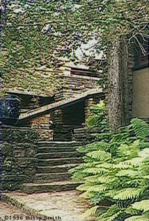 7.          半戶外空間的傢俱設計,亦出自萊特之手,線修簡潔、取材自然 室內空間一隅,天然石材的運用,似乎和外界景觀在互相對話