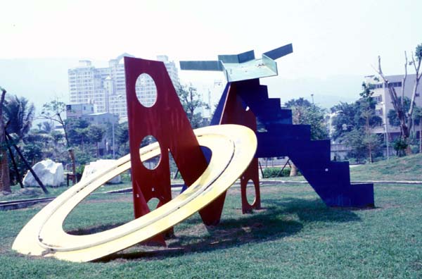 這張是在高雄的美術館拍的相片,作者是莫亞,他的作品令我印象深刻是因為這個作品中就是他的名字,讓人想忘也忘不掉,紅色的M、黃色的O、綠色的Y、藍色的A,拼起來就是MOYA啦!!很好記吧!! |