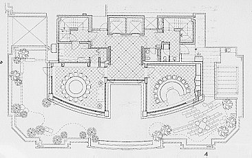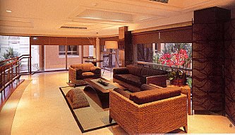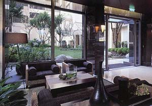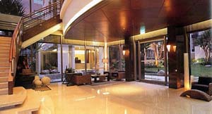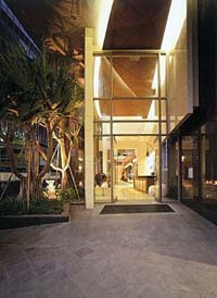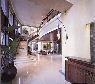設計方向定位為南洋休閒風味之門廳,入口規劃安排於接近洲際飯店的東南方,由三片高約七米的弧形玻璃牆組合而成,恰恰呼應洲際飯店的主要造型語彙,二樓會客區同樣藉由弧形梯與地面層銜接,屋頂層規劃為宴客廳與鐵板燒餐廳供住戶使用,並與屋頂花園結合,塑造悠閒渡假生活。 |